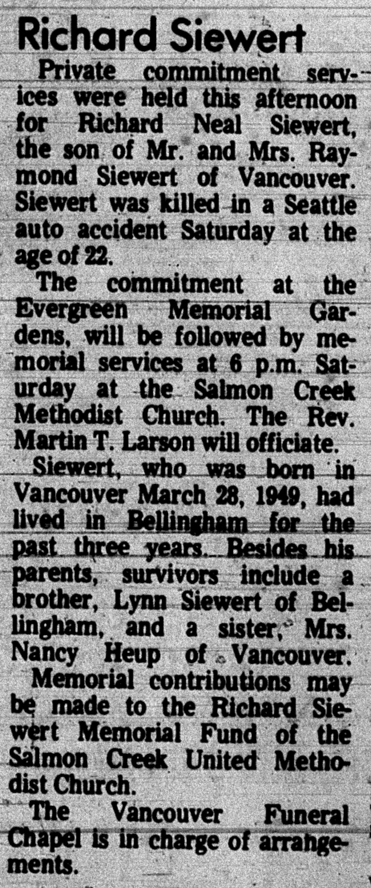 A funeral Mass was held Thursday, February 24, at Mary Queen of Peace in Sammamish Washington, with burial at Mount Tahoma National Cemetery, Kent, WA.