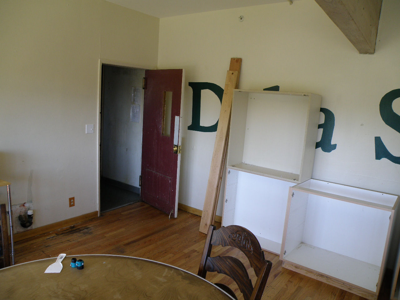 The ice machine in the dining room was removed, with the supply and drain lines capped. You can see the cap on the drain line in this picture. You can also see some of the water damage to the flooring. We also discovered water damage and mold in the basement, under this area. Drywall in two student rooms in the basement have been or will be torn down to the studs, plus we carted lots of wet drywall and wet insulation to the dump. Currently there are no students living in the basement, as the basement bathroom is next on the list for renovation. Work will continue in the basement in August.