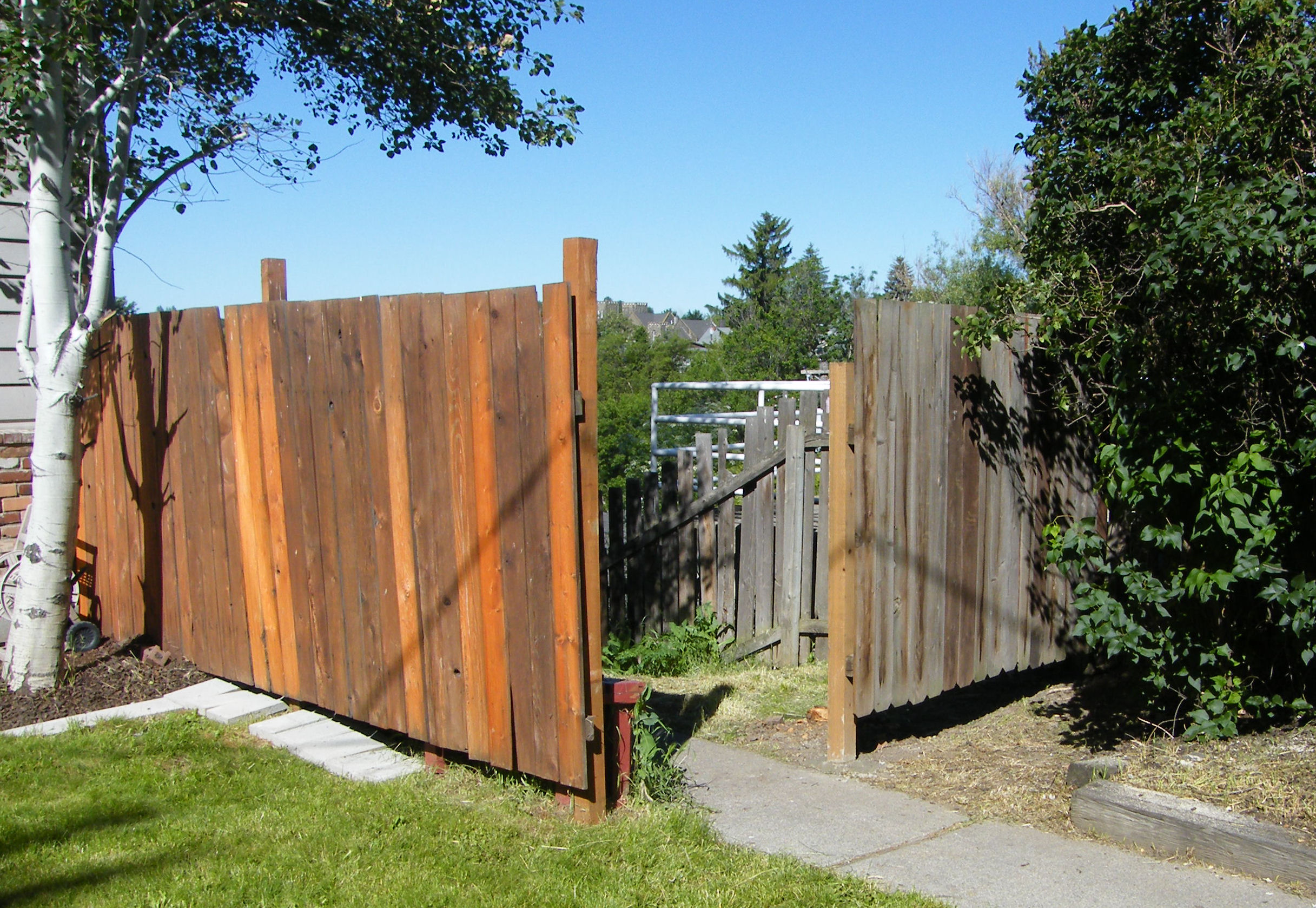 The wooden fence by the north walkway was repaired, with the installation of a new, pressure-treated fence post. Existing fence boards were sorted through with enough recycled for use with the repaired section. Dimensions were taken for a gate, to be installed in August. It is also planned to possibly eliminate the dumpster by the street and replace it with garbage cans, stored inside the fenced area. The members asked for an area to be included which would also safely store the lawn mower, as there is no easy way to transport a mower from the back yard storage shed to the front lawn.