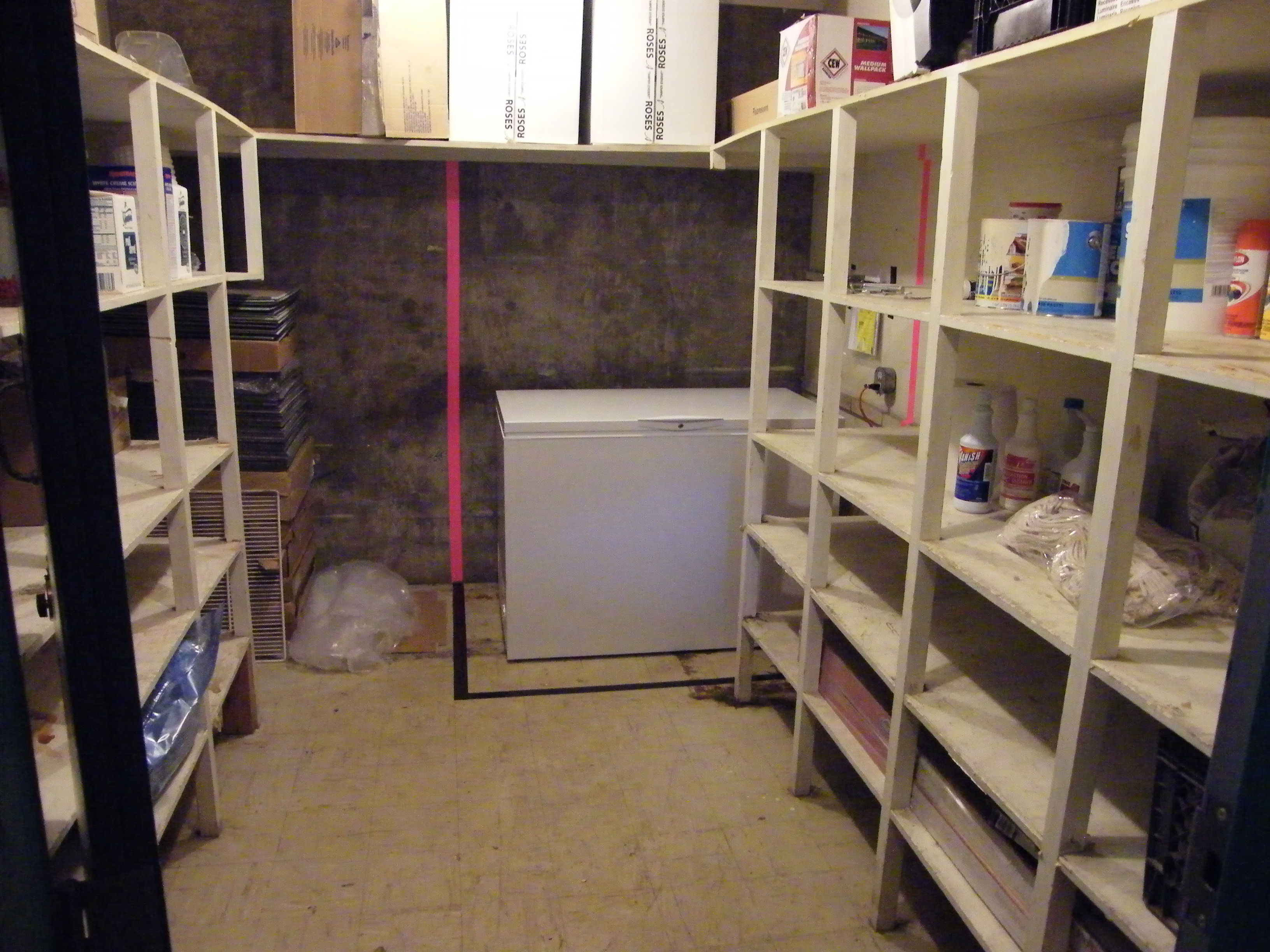The basement storage room was cleaned, drywall holes patched and a new 14 cubic foot, lockable chest freezer, courtesy of a Delta Sig alumni, was delivered, installed and began operations. The area around the new freezer was marked, to ensure sufficient air flow. The floor was mopped and the food items were separated from the non-food items. many non-food items were removed to the outside storage shed. In the photo, what appears to be an optical illusion is where the black tape on the floor meets the pink tape on the wall, which defines the new "keep free-no storage" area.