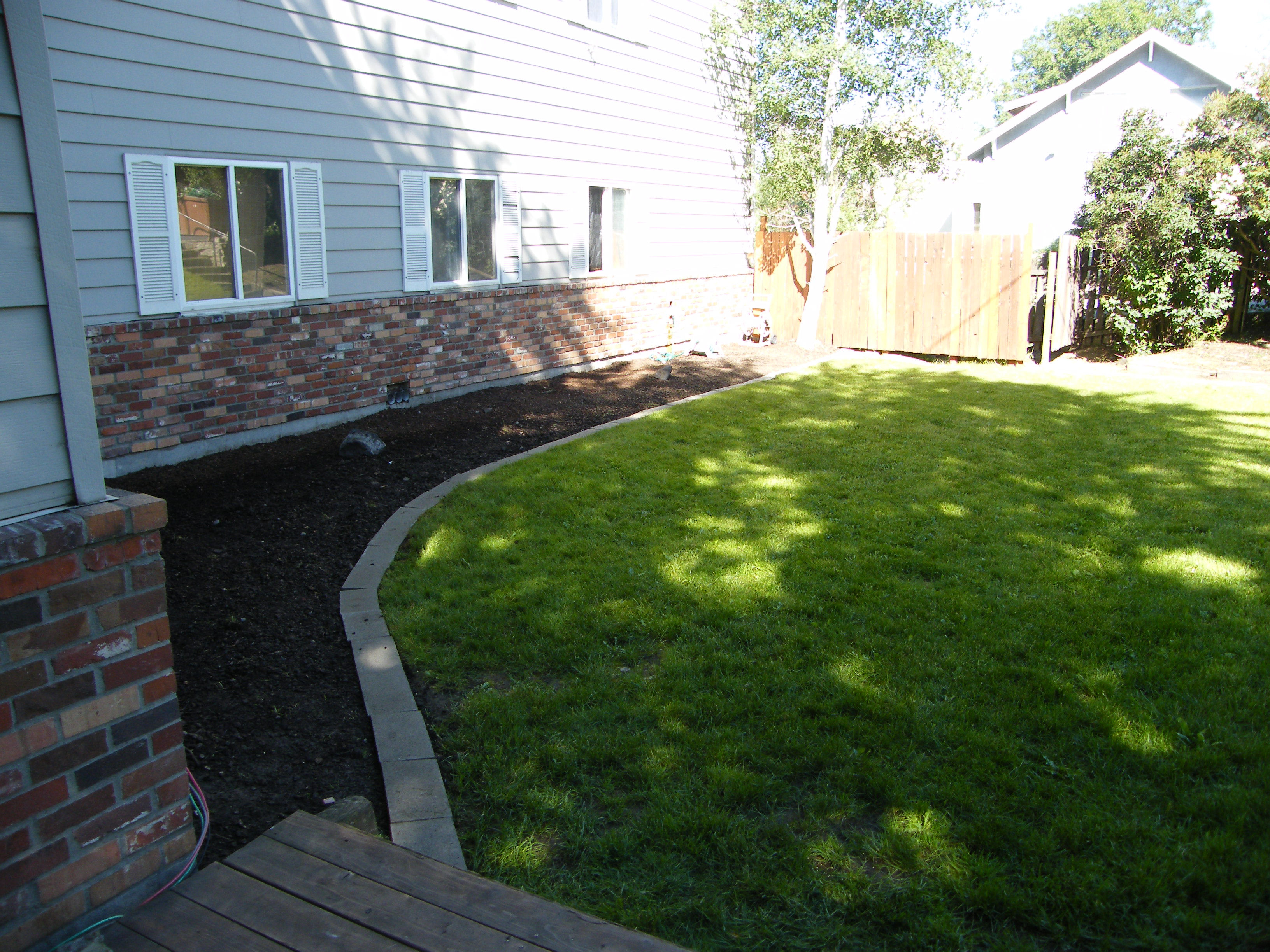 The leaky hose bib at the front of house, near the north end, was repaired. Phil Cummings also identified the water shut off valve, which was directly above the faucet handle, but was obscured by a hanging piece of tarpaper. The leak was fixed by replacing a piece of faucet extention pipe previously installed and by using teflon tape. In this same area, a brick mowing strip was added to define the lawn from the bark covered flower bed area. We also added an extra hose, extending the front yard sprinkler placement over the entire lawn and bed area without having to disconnect and move the hose. After mowing, the front lawn was fertilized and weed control applied.