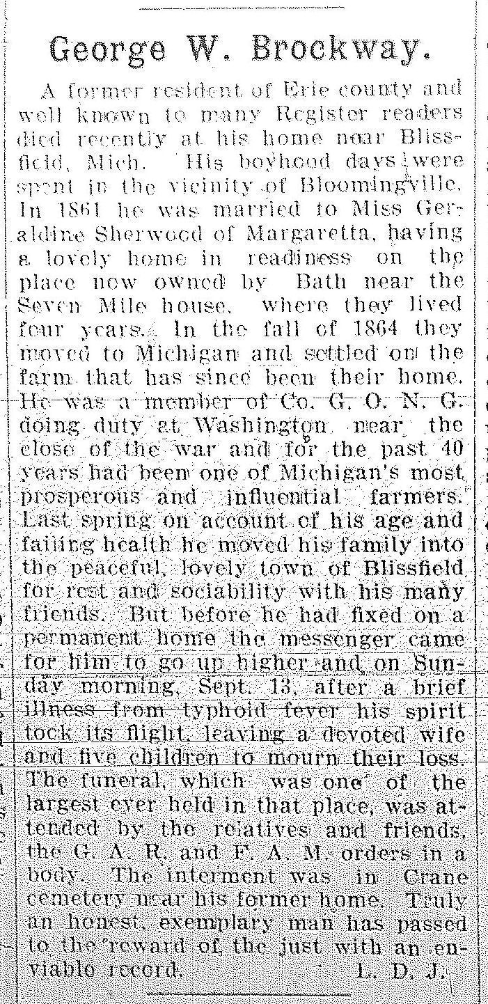 George W Brockway. A former resident of Erie County and well known to many Register readers died recently at his home near Blissfield, Mich. His boyhood days were spent in the vicinity of Bloomingville. In 1861 he was married to Miss Geraldine Sherwood of Margaretta, having a lovely home in readiness on the place now owned by Bath near the seven mile house where they lived four years In the fall of 1864 they moved to Michigan and settled on the farm that has since been their home. He was a member of Company G, Ohio National Guard, doing duty near Washington near the close of the war and for the past 40 years has been one of Michigans most prosperous and influential farmers Last spring on account of his age and failing health he moved his family into the peaceful and lovely town of Blissfield for rest and socialbility with his many friends But before he had fixed on a permanent home the messenger came for him to go up higher and on Sunday morning Sept 13,after a brief illness from Typhoid fever, his spirit took its flight, leaving a devoted wife and five children to mourn their loss. The funeral, which was one of the largest ever held in that place, was attended by the relatives and friends, the GAR and FAM orders in a body. The internment was in Crane Cemetery near his former home. Truely an honest exemplry man has passed to the reward of the just with an enviable record. |