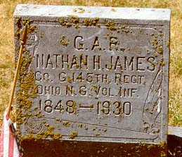 William T James, son of Henry & Abigail James, Husband of Mary Stark James. Killed in action, Battle of Corinth, Oct 4, 1862. Rank of Private, Company K, 63rd Regiment, Ohio Infantry Enlisted Sept, 1862. |
